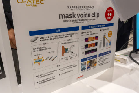 株式会社村田製作所は、「AI時代の信頼できる音声入力を実現するマスク装着型デバイス mask voice clip」を展示する。この展示はデジタル大臣賞を受賞した。