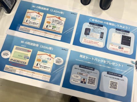 「Wi-Fi速度体験コーナー」では、つなげるWi-Fiの周波数帯による通信速度の変化について、実際のWi-Fiに接続した端末どうしを比べて解説していた。