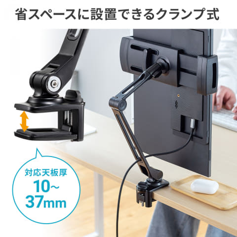 クランプ式3関節アームタイプの「PDA-STN85BK」は、厚さ10~37mmの天板にクランプで固定でき、机の上の専有面積が少ない。