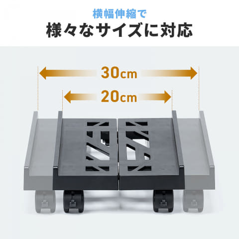 横幅20~30cmの間で調整でき、スリムタイプから大型ゲーミングPCまで対応する。耐荷重は約30kg。両サイドには落下防止ガードがあり、振動や衝撃による転倒を防止する。