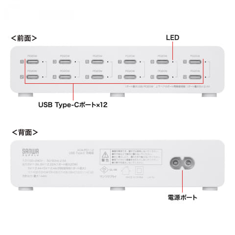 6ポート×上下2段、全12のUSB Type-Cポートを備える。USB PDに対応し、1ポートあたり最大20Wの出力が可能。上下2段の一方のみに接続した場合は20Wの出力(最大6ポート同時出力)だが、上下両方に接続した場合は5V/2.4Aの出力となる。