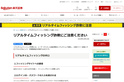 楽天証券株式会社は10月10日、「リアルタイムフィッシング詐欺にご注意ください」との注意喚起を行い、手口と注意点を解説した。