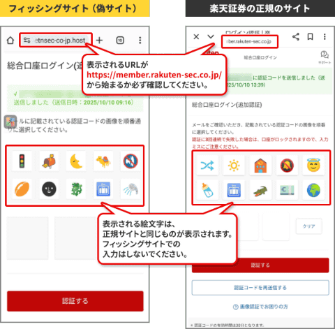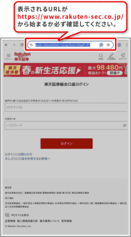楽天証券の説明する手口では、まず、メールやSMSからフィッシングサイトで誘導され、ログインIDとパスワードの入力を求められる。フィッシングサイトは見た目上は正規サイトとの区別が難しいため、表示されるURLが「https://www.rakuten-sec.co.jp/」から始まる正規のURLになっているか確認するようにとしている。