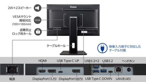 映像入力端子は、USB Type-C×1、DisplayPort×1、HDMI×1を備える。USB Type-Cポートは最大65WのUSB PD給電に対応しており、接続したPCに給電可能。同時に、ドッキングステーションとして、有線LANポート(1000BASE-T対応)×1、USB Type-Cポート×1、USB Type-Aポート×3を利用できる。