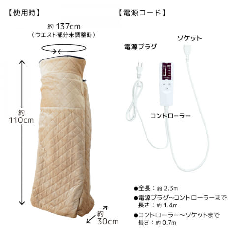 寝袋のように本製品に足を入れ、下半身を覆って使用する。電源コードを外せば、着用したまま移動も可能。不使用時の収納袋も付属する。