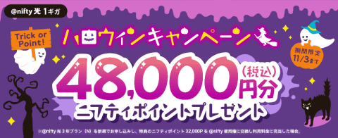 @nifty光、新規申込で4万8000円分のポイントがもらえる「ハロウィンキャンペーン」