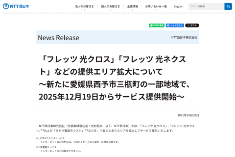 NTT西日本株式会社は10月20日、光回線によるインターネット接続サービス「フレッツ光」の提供エリア拡大を発表した。対象は、愛媛県西予市三瓶町の一部地域。最大10Gbpsの「フレッツ 光クロス」、最大1Gbpsの「フレッツ 光ネクスト」のほか、IP電話サービスの「ひかり電話ネクスト」などを新たに提供する。