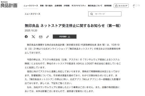 株式会社良品計画は10月20日、公式オンラインショップ「無印良品ネットストア」の受注・出荷停止が、アスクル株式会社のランサムウェア感染によるシステム障害の影響であると発表した。