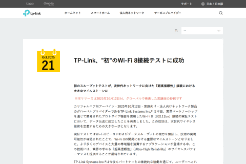 TP-Link Systemsは、業界パートナーシップを通じて開発されたプロトタイプ機器を使用したWi-Fi 8(IEEE 802.11bn)接続の実証テストにおいて、社内で初めてデータ伝送に成功したと、10月12日に発表した。