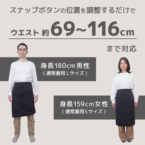 腰巻・肩掛け・膝掛けとして使える3WAY仕様になっており、スナップボタンで簡単に着脱が可能。男女兼用で、ボタンの位置を調節するとウエスト約69〜116cmまで対応している。裏面は手触りの良いフリース素材で、中央部分には5枚のヒーターを内蔵。温度は強(約45℃)・中(約40℃)・弱(約35℃)の3段階で切り替え可能だ。