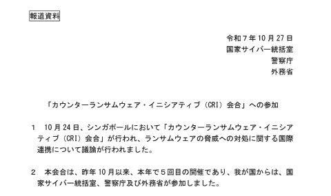 シンガポールにて10月24日に「カウンターランサムウェア・イニシアティブ(CRI)会合」が行われ、日本から国家サイバー統括室(NCO)、警察庁、外務省が参加した。