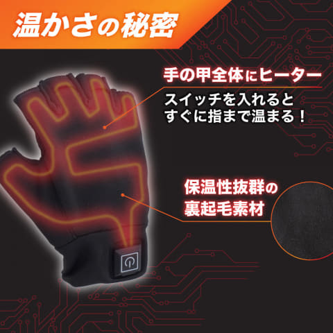ゲームなどの操作がしやすいよう指先が開いた手袋で、手の甲から指の中間までにあたる部分にヒーターを内蔵し、手全体を温める。給電はUSBポートから行い、温度は約50/45/40℃の3段階に設定できる。