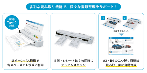 カラー、グレー、モノクロでのスキャン対応で、光学解像度はカラーとグレーで最大600dpi、モノクロで最大1200dpi。最大A4の片面スキャンに対応し、A3サイズまでの原稿は、2つ折りにして読み取ることで自動的に合成できる。名刺やレシートなど小さい原稿は複数枚同時スキャン可能。スキャン速度は1枚あたり最速5.2秒。排出方向は、原稿を曲げずに排出できるストレートパス、上部のトレイに排出し場所をとらないUターンパスの2つから選択できる。