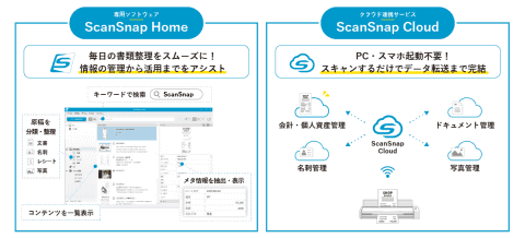 PCにUSB接続して利用するほか、Wi-Fi接続により、ワイヤレスでスキャンしたデータを転送することも可能。スキャンしたデータは専用ソフトウェア「ScanSnap Home」(Windows、macOS対応。モバイル版はiOS、iPadOS、Android、ChromeOS対応)で、データの分類や整理が可能。また、「ScanSnap Cloud」を利用することで、Google Driveなど他社クラウドサービスと連携してクラウドにデータを保存できる。