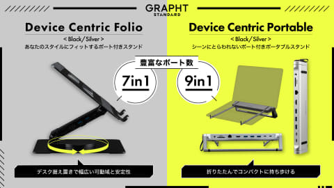 MSY株式会社は、GRAPHTブランドより、ドッキングステーション機能付きのノートPCスタンド2製品を11月7日に発売する。据え置き型でアーム部分に7ポートを備える「Device Centric Folio」とポータブル型で背面に9ポートを備える「Device Centric Portable」で、市場想定価格は1万3970円と1万2980円。