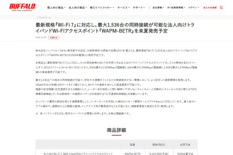 バッファロー、1536台接続可能な法人向けWi-Fi 7アクセスポイント「WAPM-BETR」を2026年夏に発売