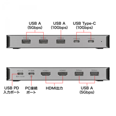 USB Type-C接続で、以下のポートを備える。USB PD入力ポートは最大100WのUSB PD受電が可能で、接続したPCに最大85Wの給電ができる。高速データ転送が可能なUSB 10Gbpsに対応。