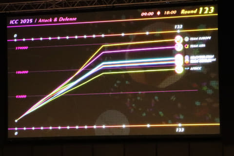 各チームの得点は、フラグの取得数だけでなく、防御の成功などのさまざまな要素を複合した計算式で算出される。定期的に集計された順位が、途中経過として観客用の画面に表示される。