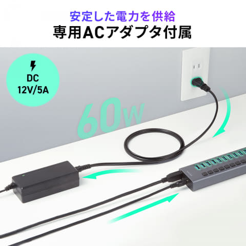付属のUSB Type-AケーブルでPCに接続し、USB 5Gbps(USB 3.2 Gen 1)対応のUSB Type-Aポート×13を拡張できる。付属のACアダプターで電源を供給するセルフパワー方式により、ポータブルHDDなどの電力消費が大きい周辺機器も安定して動作させられ、PCの電源を切っている状態でも接続している機器へ給電できるとしている。1ポートあたり最大5V/1.5Aの給電が可能。