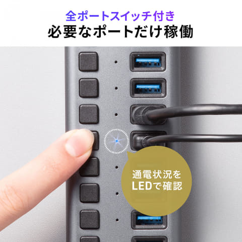 それぞれのポートには通電を管理するスイッチが搭載されており、ポートごとに使用しない機器の電源をオフにできる。LEDランプでポートや本体の通電状態を確認可能。