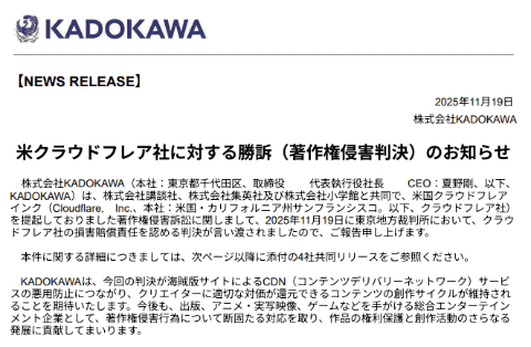この訴訟は、2022年2月に、株式会社KADOKAWA、株式会社講談社、株式会社集英社、株式会社小学館の4社が提起したもの。Cloudflareは海賊版サイトに対して同社のCDNサービスを提供しており、訴訟提起時のKADOKAWAの発表では「2018年以降、複数の悪質海賊版サイトが違法に蔵置している侵害コンテンツの公衆送信の停止、キャッシュの削除、契約更新の停止を求めてまいりましたが、同社からは、必要な措置を取ったとの回答があったものの、具体的な措置についての説明がないまま、今に至っております」とされていた。