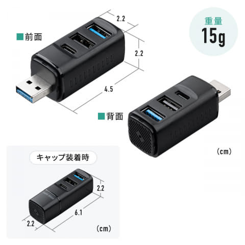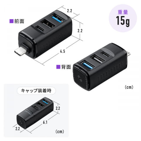 本体サイズと重量は、400-HUBCP38BKと400-HUBA39BKが4.5×2.2×2.2cmで15g、400-HUBC40BKが4×2×2cmで13g。