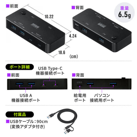 本体前面にUSB Type-Aポート×2、USB Type-Cポート×2を備え、背面にはPC接続用のUSB Type-Aポート×2を備える。前面の4つのポートに接続した周辺機器を、本体上部のスイッチにより1台目あるいは2台目のPCに接続するよう切り替えられる。