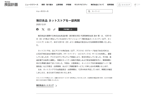 株式会社良品計画は12月1日、公式オンラインショップ「無印良品ネットストア」において、10月19日から停止していた受注と出荷を一部商品で再開した。