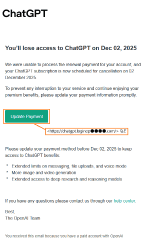 メールの内容は、ChatGPTのサブスクリプション更新の支払いに失敗したため、アカウントが利用停止になると警告し、支払い情報の更新を名目にリンクをクリックさせようとするものが確認されている。