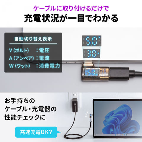 本製品にUSB Type-Cケーブルを挿し込むことで使用でき、電圧・電流・消費電力の順に自動で切り替わりながらモニター表示される。数字で状態を確認することで充電トラブルの切り分けや性能のチェックにも役立つとしている。
