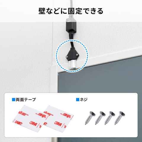 壁などへの固定は両面テープのほか、ケーブルの両端に開いているネジ穴での固定も可能。