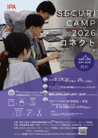 独立行政法人情報処理推進機構(IPA)と一般社団法人セキュリティ・キャンプ協議会は、若手のセキュリティ人材を創出するプログラムとして、新たに立ち上げた教育・交流プログラム「セキュリティ・キャンプコネクト」を、2026年3月26日~29日に開催する。参加希望者のエントリー締め切りは2026年1月6日23時59分。参加費は無料(交通費・宿泊費含む)。