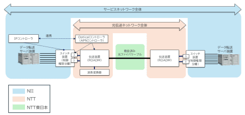 今回の実験で、NIIはデータ転送サーバーとIPコントローラーの開発、NTTはAPNコントローラーと波長変換技術及び制御権限分離技術の開発、NTT東日本は敷設済みの商用光ファイバーケーブルを用いた光ネットワークの構築を担った。