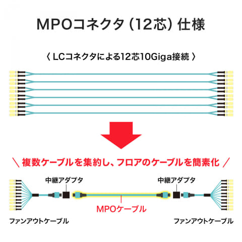 両端にMPOコネクタが付属し、中継アダプターを通して1本のケーブルで12芯をまとめて接続可能。データセンター主幹線、フロア間配線、サーバールームなどに最適としている。