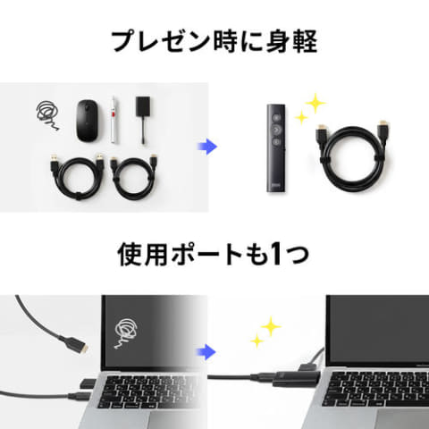 プレゼン操作用のワイヤレスリモコン(ポインター)と、USB Type-C接続のレシーバーのセット。レシーバーにHDMI変換アダプターの機能と充電用USB Type-Cポートが付属しており、USB Type-Cポート1つで、リモコンの受信、HDMI出力、PC本体への充電の3つができ、プレゼン用に持ち歩く周辺機器を減らして身軽にできることが特徴。