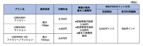 同プランは、光回線によるインターネット接続サービス「USEN光01」を利用することで、WESTERポイントが還元されるWESTER会員限定のプラン。初回契約特典として5000ポイント、継続利用特典として開通した月の3カ月後から2年間毎月500ポイントが付与され、合計で最大17000ポイントが付与される。「USEN光01」は、NTT東西の「フレッツ光」回線網を利用した光コラボレーションモデルのサービス。