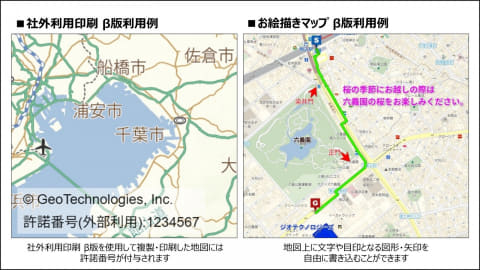 「お絵描きマップ β版」は、地図を複製・印刷する際に、地図上に文字や目印となる図形や矢印を自由に書き込める機能。道路工事の案内図や不動産物件案内、店舗チラシなどの用途に適している。すべてのユーザーが利用できる。