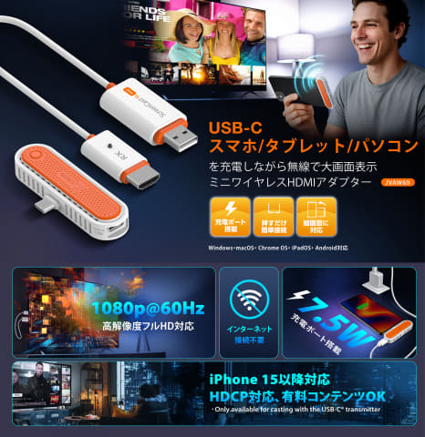 両製品とも、同社の既存モデルより小型化・軽量化したとしている。PCやスマートフォンのUSB Type-Cポート(DisplayPort Alt mode対応)に接続する送信機と、テレビなどのHDMIポートに接続する受信機のセット。受信機はどちらも共通で、ケーブル状になっている両端にHDMIとUSB Type-Aプラグが付いていて、USB Type-AプラグをUSBポートに接続して給電しながら使用する。
