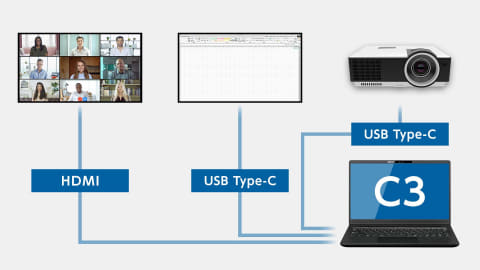 ネットワークはWi-Fi 6Eに対応するほか、ギガビット対応の有線LANポートを備える。このほか、HDMIポート×1、USB 10Gbps(USB 3.2 Gen 2)対応のUSB Type-Cポート×2、USB 10Gbps対応のUSB Type-Aポート×1、USB 5Gbps(USB 3.2 Gen 1)対応のUSB Type-Aポート×1を備える。USB Type-Cポートは映像出力にも対応し、合計で4画面でのマルチディスプレイ構成が可能。