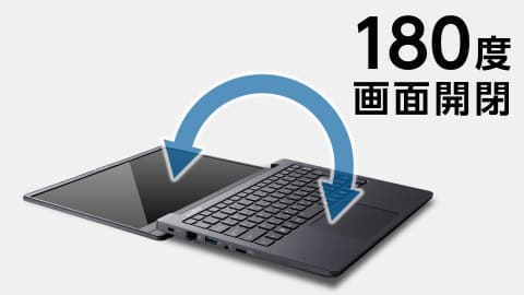 有機ELディスプレイは、MouseProブランドでは初の搭載。一般的な液晶ディスプレイに比べて高コントラストで視野角が広く、消費電力が抑えられることなどが特徴となる。バッテリー駆動時間は、動画再生時で約3.5時間、アイドル状態で約10.5時間。ディスプレイは180°開き、商談などの場で自由度の高い使い方ができる。