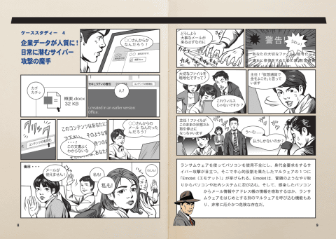 同ガイドブックでは、ランサムウェア攻撃や標的型攻撃など、実際の事例をもとにしたマンガ形式のケーススタディのほか、サイバー攻撃の知識、対サイバー攻撃のアクション、経営者が事前に備えるべき項目、もしものためのマニュアルなどが紹介されている。図解やマンガによる事例紹介も多用されていて専門知識がない人にも読みやすく、セキュリティ・IT担当者や経営者に限らず、社内全員で読み、基礎知識を身に着けられる内容だ。