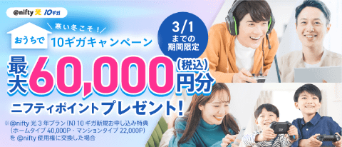 ニフティ、新規申込で最大6万円分のポイントがもらえる「寒い冬こそ!おうちで10ギガキャンペーン」実施中