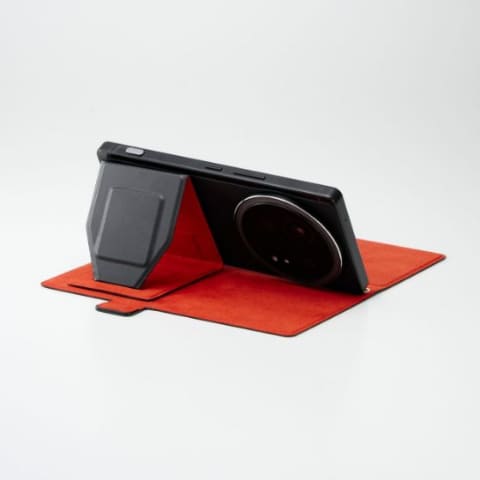 スマートフォンを自己吸着シートで固定して使用する。自己吸着シートが貼り付けられたフラップ部はカバーと独立しているため、カメラを使うときにはカバーをめくることで撮影の邪魔にならないようにでき、三角形に折りたたむことでスタンドにもなる。