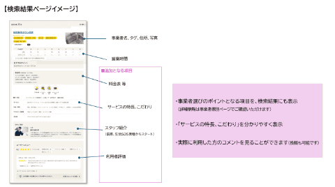 検索結果一覧ページにおいて、複数の店舗・施設を比較・検討しやすくするため、営業時間やアクセスなど、各事業者の付加情報が拡充された。
