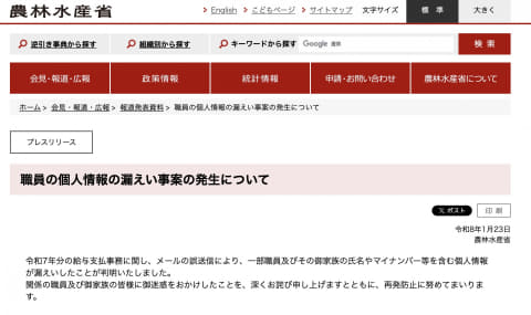 農林水産省は1月23日、メールの誤送信により一部職員および家族の個人情報が漏えいしたことを発表した。