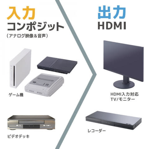 レトロゲーム機やビデオデッキなどのコンポジット信号(赤・青・黄のコネクタが付いたケーブルの信号)をHDMI信号に変換して出力できる変換アダプターで、アナログ端子が非搭載の最新テレビでもアナログ映像機器が使用できる。