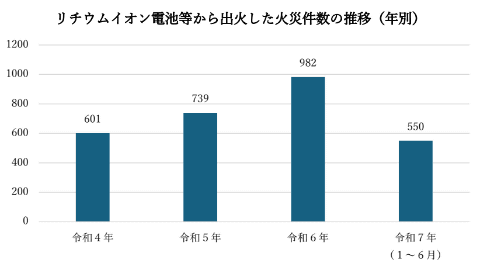 リチウムイオン電池から出火した火災件数は右肩上がりで推移しており、2022年は601件、2023年は739件、2024年は982件、2025年は1月~6月の半年で550件となっている。