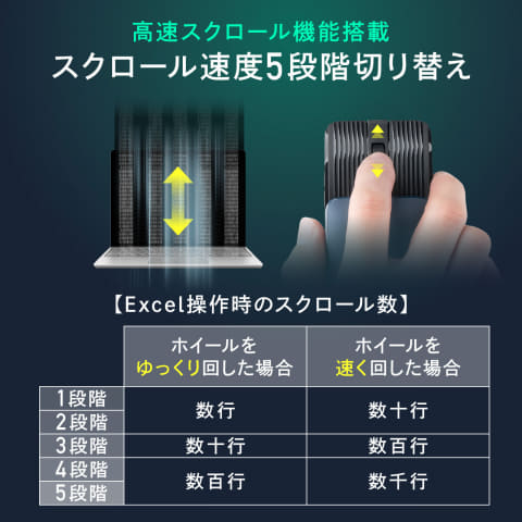 スクロールホールは高速スクロール対応で、用途に合わせて5段階で速度を切り替え可能。マウス内部のソフトが自動で増幅して高速化させる仕様で、正面のLEDの点滅回数から速度の段階を確認できる。