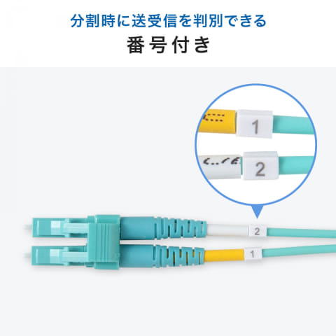 コネクタはLC×2-LC×2で、1芯ずつの分割も可能。それぞれに番号が付いており、分割した際にも送信側・受信側を見分けやすい。ケーブルには低発煙材料(LSZH)を採用し、内部補強がない代わりに、細く柔軟なことが特徴で、ラックやダクト内での取り回しに優れるとしている。ケーブル外径(1芯あたり)は2.0×4.0mm。