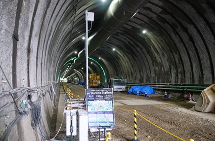 今回実証した方法では、au Starlink Stationにより、最小限の設備で約4kmと広い通信エリアを構築し、切羽(トンネル掘削工事の最前面)からSkydio Dock for X10のドックまでを通信エリア内に収めた。